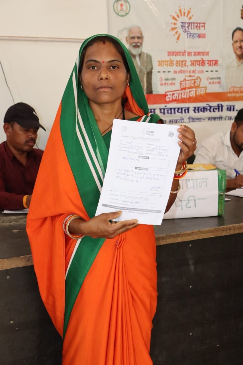 जनपद पंचायत सक्ती अन्तर्गत ग्राम पंचायत किरारी निवासी श्रीमती वृंदा बाई ने अपने घर में शौचालय नहीं होने के कारण शौचालय का निर्माण किये जाने के लिए आवेदन किया। श्रीमती वृंदा बाई ने कहा कि सरकार द्वारा लोगो के जीवन स्तर को बेहतर बनाने के लिए सार्थक प्रयास किया गया है। उन्होंने कहा कि आमजन अपनी जरूरतों की पूर्ति के लिए बढ़ चढ़कर कर सुशासन तिहार में आवेदन कर रहे है। शासन, प्रशासन द्वारा गंभीरता से उनकी समस्याओं का निराकरण किया जाएगा, इस बात का उन्हें पूरा भरोसा है। इसी प्रकार ग्राम पंचायत सकरेली (ब) निवासी श्रीमती मोंगरा बाई बरेठ ने प्रधानमंत्री आवास योजना से लाभान्वित करने हेतु आवेदन प्रस्तुत किया l उन्होंने कहा कि उन्हें प्रधानमंत्री आवास योजना का लाभ प्राप्त नहीं हुआ है l जिसके लिए उन्होंने आज आपना आवेदन प्रस्तुत किया है l उन्होंने कहा कि राज्य शासन द्वारा इस आयोजन के माध्यम से शासन की योजनाओं का निर्धारित समय सीमा में क्रियान्वयन सुनिश्चित करने के लिए पुख्ता उपाय किए जा रहे हैं। जिससे निश्चित रूप से आम जनता को योजनाओं का लाभ मिल पाएगा।