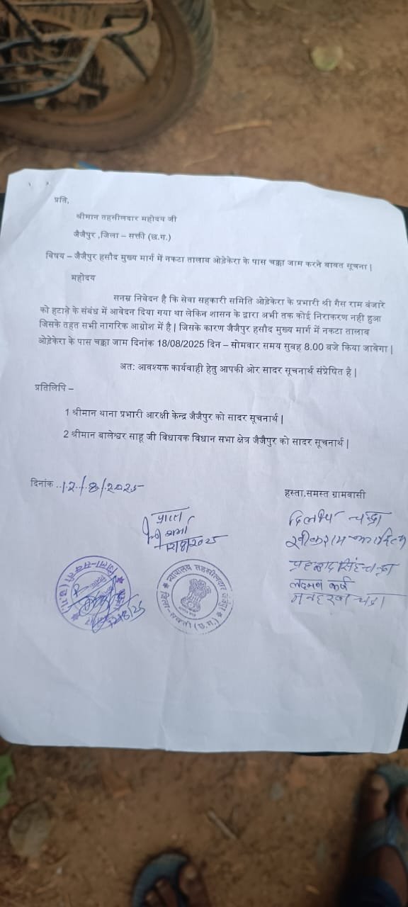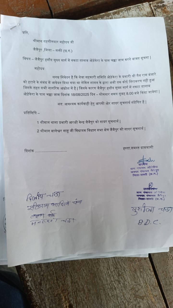 दिया जा चुका है लेकिन अधिकारियों के द्वारा उचित कार्रवाई नहीं किए जाने के चलते संस्था प्रबंधक का मनोबल बढ़ा हुआ है जिससे किसान काफी परेशान है किसानों का कहना है कि गैस राम बंजारे को तत्काल हटाकर दूसरा संस्था प्रबंधक व्यवस्था नहीं किया गया है। किसानों का कहना है कि संस्था प्रबंधक को नहीं हटाने पर आगे आंदोलन की बात कही गई। परंतु उसके बावजूद भी संस्था प्रबंधक को नहीं हटाया गया इस वजह से ग्राम वासियों ने यह निर्णय लिया कि 18.08.2025को चक्का जाम करने के लिये तहसीलदार जैजैपुर को ज्ञापन सोंपा गया।