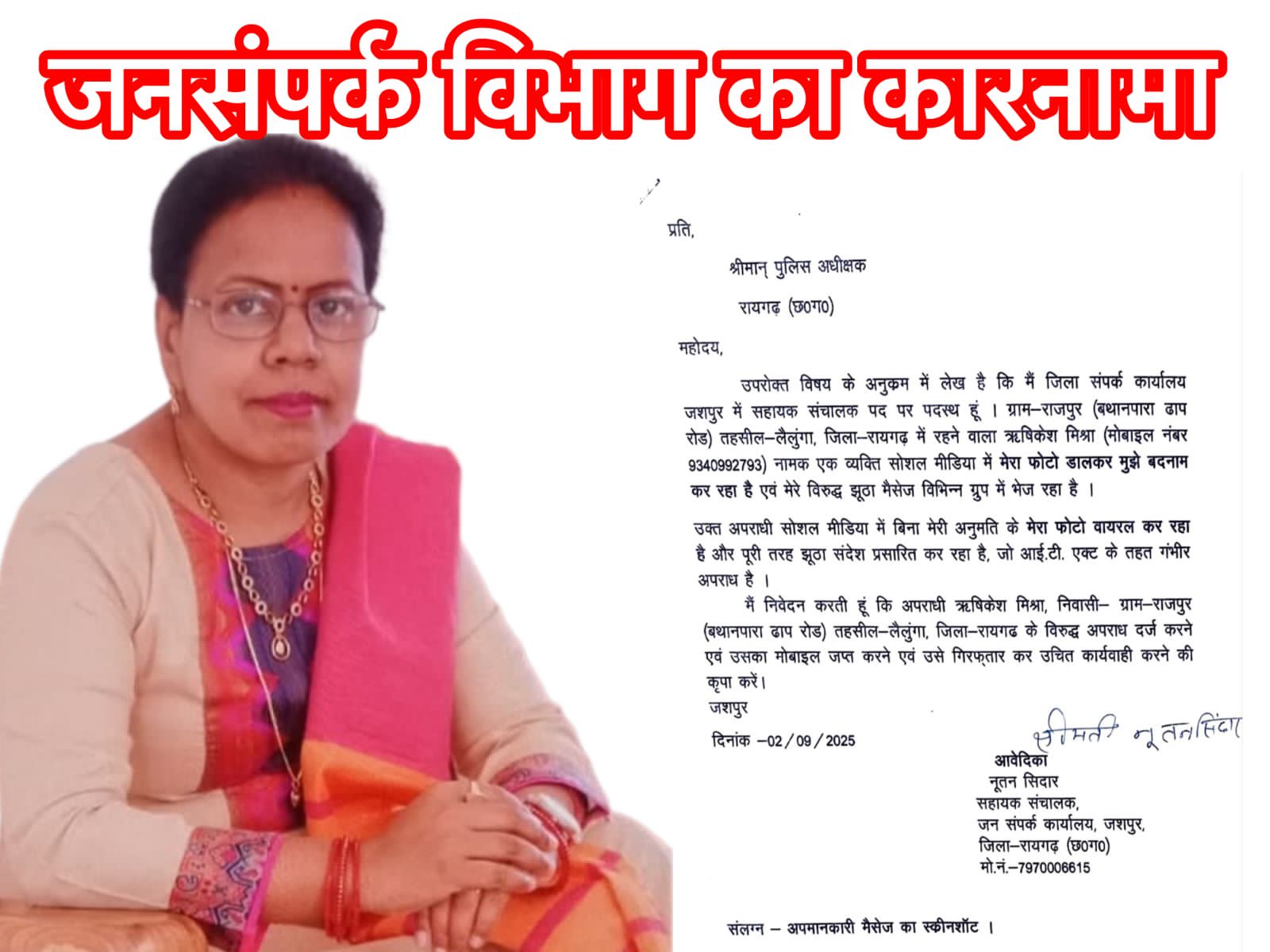 सहायक संचालक नूतन सिदार विवादों में, मुख्यमंत्री विष्णु देव साय के गृह ज़िले से उठी प्रेस की आज़ादी पर बड़ी बहस सोशल मीडिया पर विवादित प्रकरण: क्या सहायक संचालक नूतन सिदार अपनी पद की गरिमा भूल रही हैं?रायपुर/रायगढ़/जशपुर । विशेष रिपोर्ट मुख्यमंत्री विष्णु देव साय के गृह ज़िले से एक ऐसा मामला सामने आया है जिसने पूरे प्रदेश की पत्रकार बिरादरी को हिला दिया है। जनसम्पर्क विभाग की सहायक संचालक नूतन सिदार ने पत्रकार ऋषिकेश मिश्र पर मानहानि का आरोप लगाते हुए पुलिस अधीक्षक रायगढ़ से FIR, मोबाइल जब्ती और गिरफ्तारी की मांग की है।जिला सम्पर्क कार्यालय जशपुर की सहायक संचालक नूतन सिदार एक बार फिर विवादों में घिर गई हैं। इस बार उन्होंने सोशल मीडिया पर फैल रही खबरों और मैसेजों को लेकर पुलिस अधीक्षक रायगढ़ को शिकायत दी है। उन्होंने आरोप लगाया है कि रायगढ़ जिले के एक ग्रामीण युवक ऋषिकेश मिश्र उनकी फोटो और संदेश वायरल कर बदनाम कर रहा है।लेकिन बड़ा सवाल यह है कि क्या हर आलोचना को दबाने के लिए प्रशासनिक पद पर बैठे अधिकारी सीधे पुलिस कार्रवाई और गिरफ्तारी की धमकी का सहारा लेंगे? लोकतांत्रिक समाज में पत्रकार और आमजन सवाल पूछेंगे ही, परंतु क्या इन सवालों का जवाब कार्रवाई से दिया जाएगा?मुख्यमंत्री के विभाग पर सवालगौरतलब है कि नूतन सिदार जिस जनसम्पर्क विभाग से जुड़ी हैं, वही विभाग सीधे मुख्यमंत्री विष्णु देव साय के पास है। ऐसे में यह मामला केवल एक अफसर और एक पत्रकार तक सीमित नहीं रह गया, बल्कि यह अब सीधे मुख्यमंत्री की छवि और उनके शासन के रुख से जुड़ गया है।👉 सवाल उठ रहा है कि क्या मुख्यमंत्री के गृह ज़िले में ही पत्रकारों की आवाज़ दबाई जाएगी?👉 क्या मुख्यमंत्री का विभाग ही लोकतंत्र और प्रेस की स्वतंत्रता पर सवाल खड़ा करेगा?आलोचना सहन क्यों नहीं?नूतन सिदार की शिकायत से यह साफ झलकता है कि वह किसी भी तरह की आलोचना या टिप्पणी बर्दाश्त करने को तैयार नहीं हैं। पद पर रहते हुए यह उनकी ज़िम्मेदारी है कि वे पारदर्शिता और जवाबदेही से काम करें। मगर सोशल मीडिया पर सवाल उठने पर उसे “आईटी एक्ट का गंभीर अपराध” बताकर सीधे गिरफ्तार कराने की मांग क्या लोकतांत्रिक मूल्यों का गला नहीं घोंटती?अधिकारी या दबाव बनाने वाली?आवेदन में नूतन सिदार ने जिस तरह सख्ती से कार्रवाई की मांग की है, उससे यह संदेश जा रहा है कि वह अपने पद का इस्तेमाल करके जनता की आवाज़ दबाने और आलोचकों को डराने की कोशिश कर रही हैं। यह रवैया जनसम्पर्क विभाग के मूल उद्देश्य के ही विपरीत है। विभाग का काम जनता और शासन के बीच सेतु का बनना है, न कि आम लोगों के खिलाफ मुकदमे दर्ज कराना।प्रेस की स्वतंत्रता पर हमलापत्रकार संगठनों ने इसे प्रेस की आज़ादी पर स