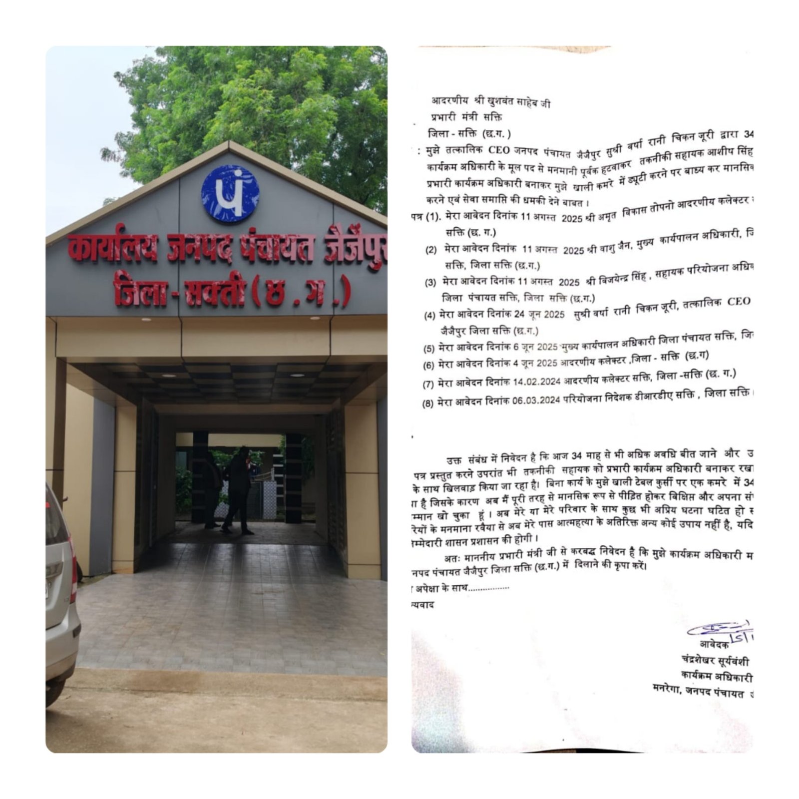 चंद्रशेखर सूर्यवंशी द्वारा अपना मूल पद कार्यक्रम अधिकारी मनरेगा , का प्रभार दिये जानें कि मांग प्रभारी मंत्री खुशवंत साहब से की है मामला जनपद पंचायत जैजैपुर जिला सक्ति का है जहा एक कार्यक्रम अधिकारी मनरेगा को उसके मूल पद से हटाकर किनारे बैठा दिया गया है जिसका नाम चंद्रशेखर सूर्यवंशी है जिसका मूल पद कार्यक्रम अधिकारी मनरेगा हैं। चंद्रशेखर सूर्यवंशी ने प्रभारी मंत्री शक्ति खुशवंत साहब से अपना मूल पत्र कार्यक्रम अधिकारी दिलाने का मांग किया गया है और अपने आवेदन में जनपद पंचायत जैजैपुर के मुख्य कार्यपालन अधिकारी वर्षा रानी चिकन जूरी पर प्रताड़ना का आरोप भी लगाया है।उक्त संबंध में आवेदक ने बताया कि उन्हें 34 माह से भी अधिक अवधि बीत जाने और उपरोक्त संदर्भित 8 आवेदन पत्र प्रस्तुत करने उपरांत भी तकनीकी सहायक को प्रभारी कार्यक्रम अधिकारी बनाकर रखा गया है और उनके भविष्य के साथ खिलवाड़ किया जा रहा है बिना कार्य के उन्हें खाली टेबल कुर्सी पर एक कमरे में 34 माह से बैठक रखा गया है जिसके कारण अब वह पूरी तरह से मानसिक रूप से पीड़ित होकर विक्षिप्त और अपना संपूर्ण अस्तित्व और आत्म सम्मान खो चुका है और अब वह अधिकारियों के मनमानी रवैया से परेशान होकर आत्महत्या तक की बात कर रहे हैं जिसकी संपूर्ण जवाबदारी शासन प्रशासन को बताया जा रहा है । उन्होंने अपने आवेदन में कहा है कि यदि जल्द से जल्द उन्हें अपना मूल पद कार्यक्रम अधिकारी मनरेगा का प्रभार नहीं दिया जाता है तो वह आत्महत्या करने के लिए मजबूर होंगे।