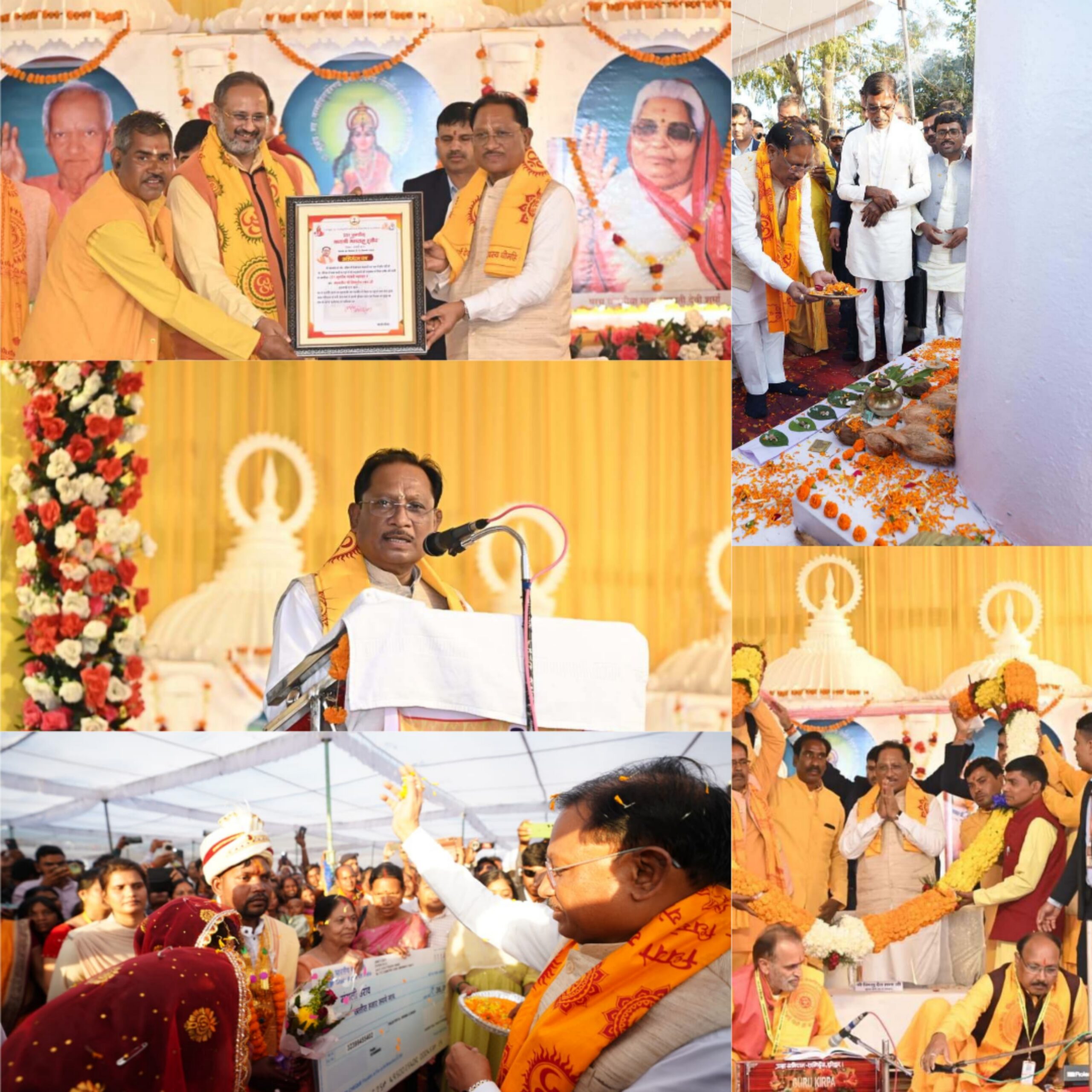 योजना का उल्लेख करते हुए उन्होंने बताया कि इसके माध्यम से अब तक 38 हजार से अधिक श्रद्धालुओं ने अयोध्या में प्रभु श्रीरामलला का दर्शन किया है।मुख्यमंत्री श्री साय ने कहा कि गायत्री मंत्र के 24 अक्षर 24 सिद्धियों और शक्तियों के प्रतीक हैं, जो मानव जीवन को ऊर्जा, सदाचार और आध्यात्मिक शक्ति प्रदान करते हैं। कार्यक्रम के दौरान देव संस्कृति विश्वविद्यालय, शांतिकुंज हरिद्वार के कुलपति डॉ. चिन्मय पण्डया ने मुख्यमंत्री का सम्मान करते हुए उन्हें अभिनंदन पत्र भेंट किया।इस अवसर पर प्रभारी मंत्री श्री गुरु खुशवंत साहेब, पूर्व विधायक श्री निर्मल वर्मा, पूर्व विधायक श्री खिलावन साहू, जिला पंचायत अध्यक्ष श्रीमती द्रौपदी कीर्तन चंद्रा, जिला पंचायत उपाध्यक्ष श्री कमल किशोर पटेल, जिला पंचायत सदस्य श्री आयुष शर्मा, श्री टिकेश्वर गवेल, श्रीमती संयोगिता युद्धवीर सिंह जूदेव, बिलासपुर संभाग आयुक्त श्री सुनील कुमार जैन, आई जी श्री संजीव शुक्ला, कलेक्टर श्री अमृत विकास तोपनो, एसपी श्री प्रफुल्ल ठाकुर, जिला पंचायत सी ई ओ श्री वाशु जैन, सहित विभिन्न जनप्रतिनिधि, गणमान्य नागरिक, संबंधित अधिकारी-कर्मचारी तथा बड़ी संख्या में वर-वधु के परिजन उपस्थित थे। साथ ही देशभर से आए अखिल विश्व गायत्री परिवार के प्रतिनिधि और बड़ी संख्या में श्रद्धालु उपस्थित थे। 140 नवविवाहित जोड़ों को दिया आशीर्वाद – कन्या विवाह योजना के अंतर्गत प्रोत्साहन राशि प्रदान मुख्यमंत्री श्री विष्णु देव साय ने मुख्यमंत्री कन्या विवाह योजना के अंतर्गत हसौद में परिणय-सूत्र में बंधने वाले 140 नवविवाहित जोड़ों को शुभकामनाएँ और आशीर्वाद दिया।