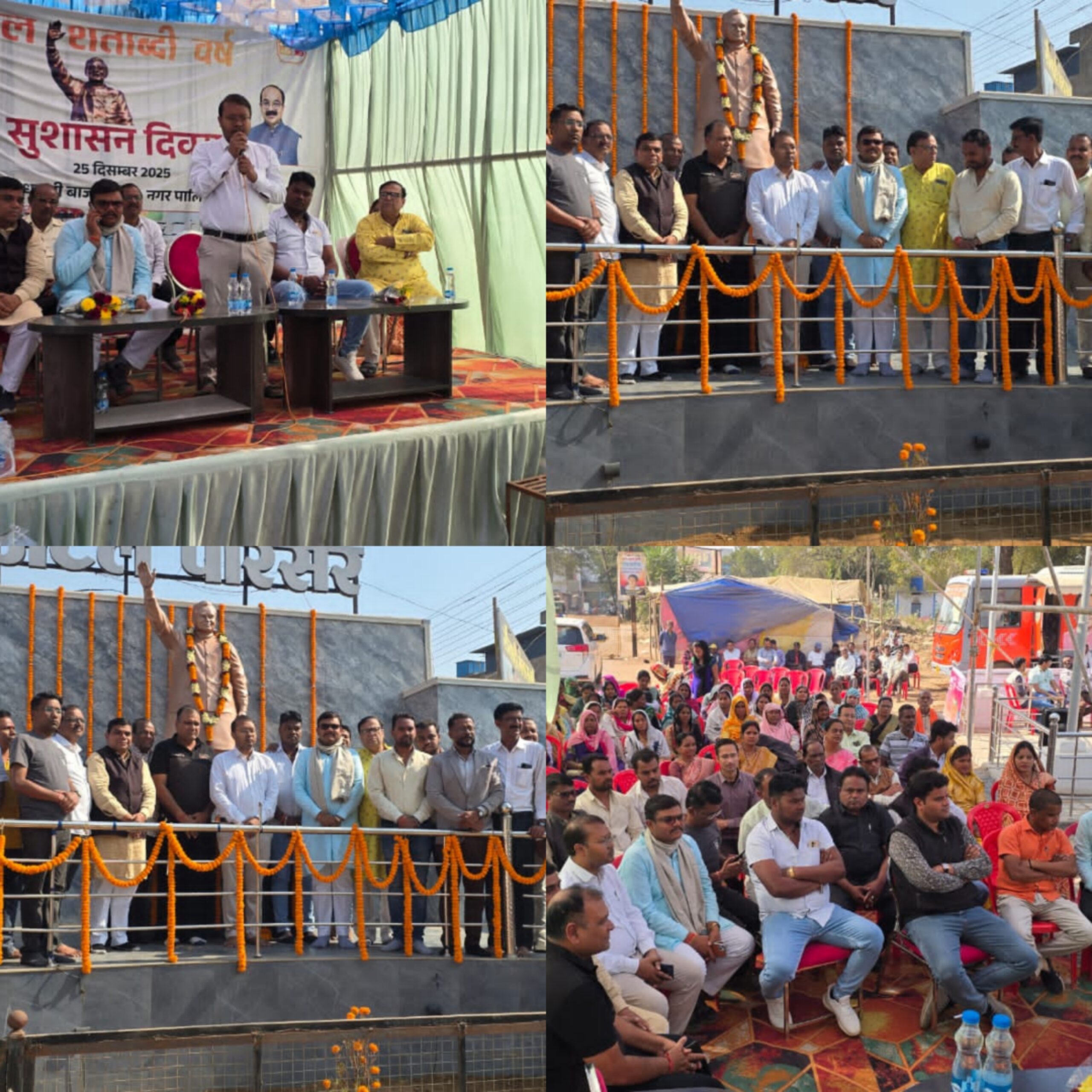 अटल परिसर में पूर्व प्रधानमंत्री स्व. श्री अटल बिहारी वाजपेयी जी की जन्म जयंती पर सुशासन दिवस कार्यक्रम का हुआ आयोजन सक्ती 25 दिसंबर 2025/ छत्तीसगढ़ शासन नगरीय प्रशासन विकास विभाग के निर्देशानुसार नगर पालिका परिषद सक्ती द्वारा आज 25 दिसंबर को सक्ती शहर के बुधवारी बाजार में नवनिर्मित अटल परिसर में पूर्व प्रधानमंत्री स्व. श्री अटल बिहारी वाजपेयी जी की जन्म जयंती पर सुशासन दिवस कार्यक्रम आयोजित किया गया। इस अवसर पर कलेक्टर सहित विभिन्न जनप्रतिनिधियों द्वारा सर्वप्रथम अटल परिसर में अटल जी की विशालकाय प्रतिमा पर पुष्प अर्पित करते हुए उन्हें स्मरण किया गया, साथ ही इस अवसर पर आयोजित मंचीय कार्यक्रम के दौरान नगर पालिका सक्ती के मुख्य नगर पालिका अधिकारी श्री प्रहलाद पांडेय एवं उप यंत्री श्री तारकेश्वर नायक द्वारा आगंतुक सभी अतिथियों का पुष्पाहार भेंटकर स्वागत किया गया। कार्यक्रम में सक्ती जिले के कलेक्टर श्री अमृत विकास तोपनो ने सर्वप्रथम पूर्व प्रधानमंत्री स्व. श्री अटल बिहारी वाजपेयी जी को नमन किया तथा उपस्थित जनों को संबोधित करते हुए कहा कि सुशासन दिवस के आयोजन के माध्यम से पूर्व प्रधानमंत्री स्व. श्री अटल बिहारी वाजपेयी जी की मंशानुरूप आम नागरिकों को बेहतर सुविधाएं उपलब्ध करवाना तथा शासन की योजनाओं का समुचित एवं बेहतर ढंग से क्रियान्वन करना ही मुख्य रूप से उद्देश्य है। तत्पश्चात मुख्य नगर पालिका अधिकारी श्री प्रहलाद पांडेय ने शासन के निर्देशानुसार सुशासन दिवस के आयोजित कार्यक्रम के संबंध में विस्तार पूर्वक जानकारी देते हुए बताया कि आज का दिन पूर्व प्रधानमंत्री स्व श्री अटल बिहारी वाजपेयी जी की जन्म जयंती पर आयोजित किया जा रहा है। कार्यक्रम के दौरान उपस्थित जनप्रतिनिधियों ने भी कार्यक्रम को संबोधित करते हुए कहा कि छत्तीसगढ़ राज्य का निर्माण अटल जी ने किया तथा अटल जी ने प्रधानमंत्री रहते हुए इस देश को एक नई दिशा दी एवं ऊंचाइयो की ओर अग्रेषित किया। आज उनकी जन्म जयंती पर हम सभी उन्हें सम्मानपूर्वक स्मरण करते हैं। नगर पालिका परिषद सक्ती द्वारा आज आयोजित कार्यक्रम के दौरान श्री टिकेश्वर गबेल, नगर पालिका सक्ती के उपाध्यक्ष श्री भारत यादव, सांसद प्रतिनिधि श्री संजय रामचंद्र, श्री रामनरेश यादव, श्री गोविंद देवांगन, सर्वश्री धरमलाल रात्रे, सुरेश साहू, ऋषि कुमार गोयल, मांगेराम अग्रवाल, आदित्य अग्रवाल राजा, अभिषेक बंसल, गोविंदा निराला, पार्षद श्रीमती अनीता गोपाल यादव, रामावतार साहू, सुश्री केसरी द्विवेदी,शयन शुक्ला, मोहम्मद इब्राहिम खान, संतोष सोनी लाला, दिलीप सराफ, धनंजय नामदेव, प्रेमलाल पटेल, नटवरलाल गोंड, राम सिंह सिदार, मनोज सोनी सहित काफी संख्या में नगर पालि