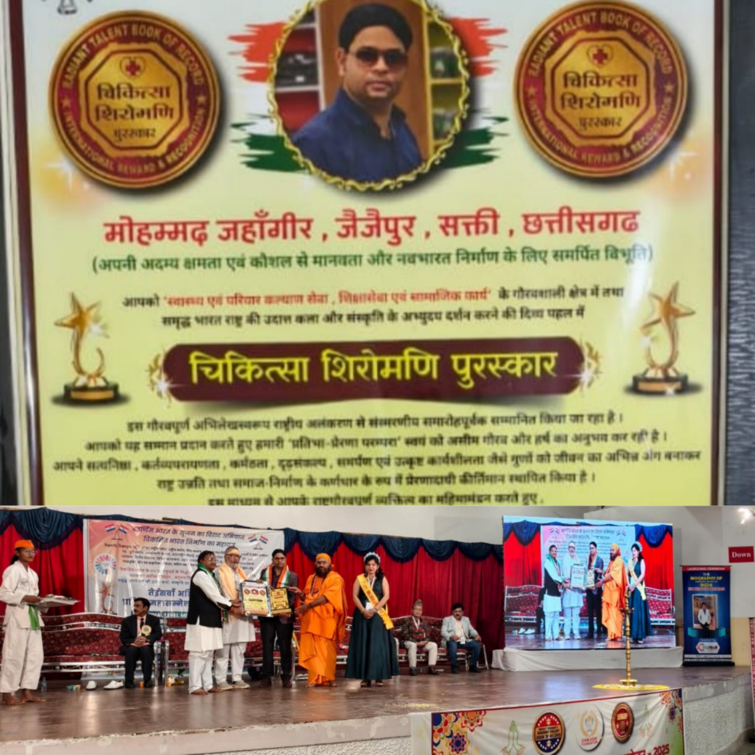 ग्रामीण स्वास्थ्य सेवा के प्रेरणास्रोत बने मोहम्मद जहाँगीर, ‘चिकित्सा शिरोमणि अवार्ड’ से सम्मानित जैजैपुर- नागपुर (महाराष्ट्र) में आयोजित तेइसवें अखिल भारतीय प्रतिभा महासम्मेलन–2025 के अवसर पर समाजसेवा और चिकित्सा क्षेत्र में उल्लेखनीय योगदान देने वाले नगर पंचायत जैजैपुर, जिला- सक्ती (छ.ग.) निवासी मोहम्मद जहाँगीर को ‘चिकित्सा शिरोमणि अवार्ड’ से सम्मानित किया गया। यह सम्मान उन्हें ग्रामीण एवं वंचित वर्गों के लिए निरंतर की जा रही निःस्वार्थ सेवाओं के लिए प्रदान किया गया।मोहम्मद जहाँगीर द्वारा ग्रामीण स्वास्थ्य सेवा एवं जीवनदायिनी साथी फाउंडेशन (NGO) के माध्यम से अनाथ बच्चों की शिक्षा, गरीब एवं विशेष पिछड़ी जनजाति पहाड़ी कोरवा समुदाय के स्वास्थ्य परीक्षण, स्वास्थ्य जागरूकता अभियान तथा शिक्षा–स्वास्थ्य के क्षेत्र में जनजागरूकता के लिए निरंतर कार्य किए जा रहे हैं। साथ ही, गरीब व अनाथ स्कूली बच्चों को शैक्षणिक सामग्री उपलब्ध कराकर उन्होंने समाज में सकारात्मक बदलाव की मिसाल प्रस्तुत की है।कार्यक्रम में उपस्थित गणमान्य अतिथियों ने कहा कि मोहम्मद जहाँगीर का कार्य केवल सेवा नहीं, बल्कि मानवता के प्रति गहरी प्रतिबद्धता का प्रतीक है। यह सम्मान उनकी सेवा-भावना, समर्पण और सामाजिक उत्तरदायित्व का सशक्त प्रमाण है। सम्मान प्राप्त होने पर शुभचिंतकों, सामाजिक संगठनों एवं मित्रों ने उन्हें बधाई देते हुए उज्ज्वल भविष्य की कामना की। सभी ने आशा व्यक्त की कि वे आगे भी इसी ऊर्जा और संकल्प के साथ समाजसेवा करते रहेंगे और जरूरतमंदों के जीवन में आशा की किरण बनेंगे। यह उपलब्धि पूरे समाज के लिए गर्व का विषय है। इस उपलब्धि के लिए विजय कुमार यादव, सुदेश देवांगन, छोटा भाई, रहमतुल्ला खान, दिलीप देवांगन इत्यादि साथियों ने हार्दिक बधाई एवं शुभकामनाएं प्रेषित किया है।
