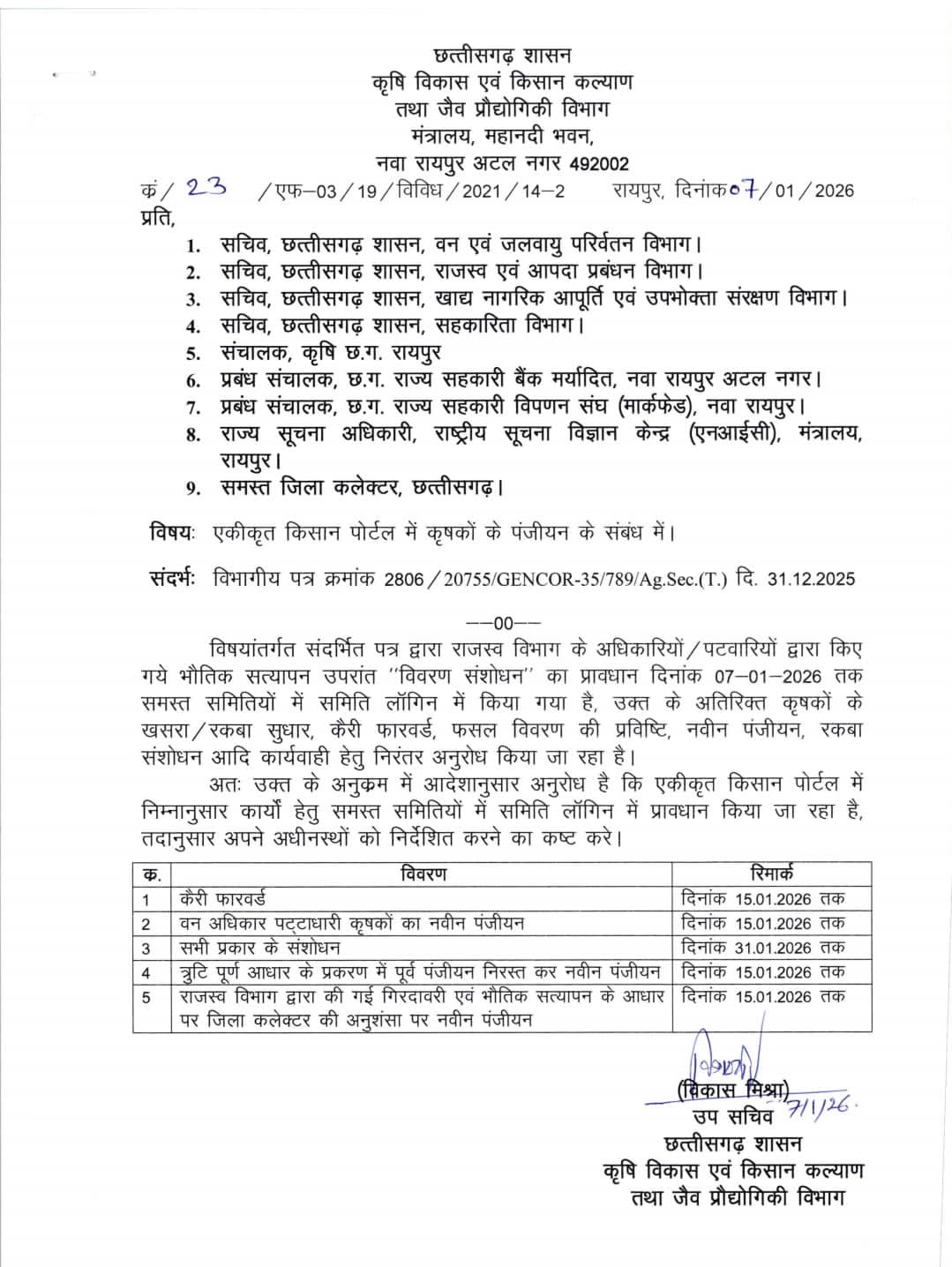 एकीकृत किसान पंजीयन में समय कि वृद्धि किसानों की समस्या को देखते हुए एकीकृत किसान पंजीयन के समय मे वृद्धि किया गया है। यह समय 7 तारीख तक था जिसे अब बढाकर 15 जनवरी 2026 तक किया गया है।कैरी फॉरवर्ड, वन पट्टा नवीन पंजीयन, फसल संशोधन, आधार संशोधन इत्यादि का विकल्प समिति के एकीकृत आईडी में 15 जनवरी तक* ओपन किया जा रहा है। जिन कृषकों की समस्या है उन्हें निराकरण करवा लेंगे।