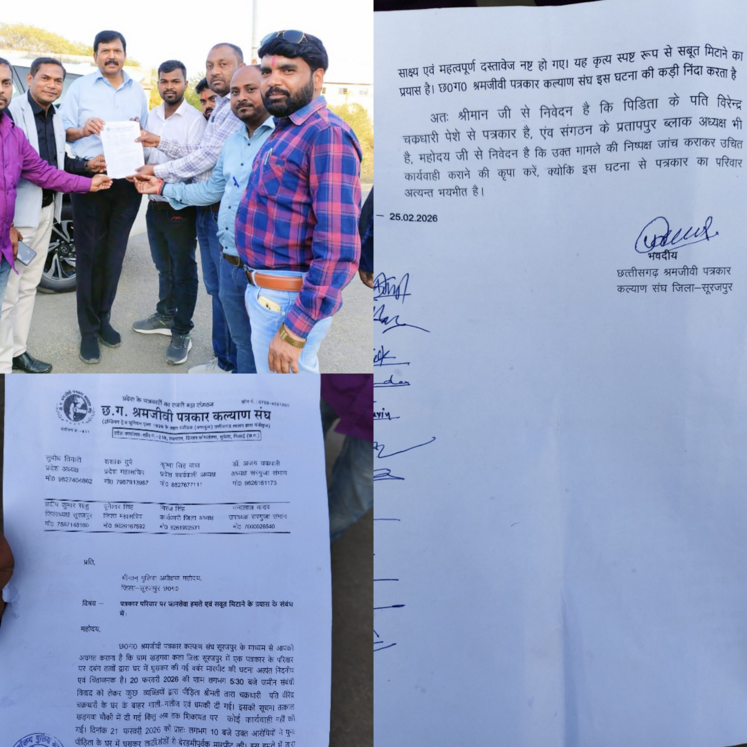 जिला सूरजपुर छ ग श्रमजीवी पत्रकार कल्याण संघ ने पुलिस अधीक्षक सूरजपुर को सौपा ज्ञापन पत्रकार के परिवार पर दबंगों ने किया जानलेवा हमला