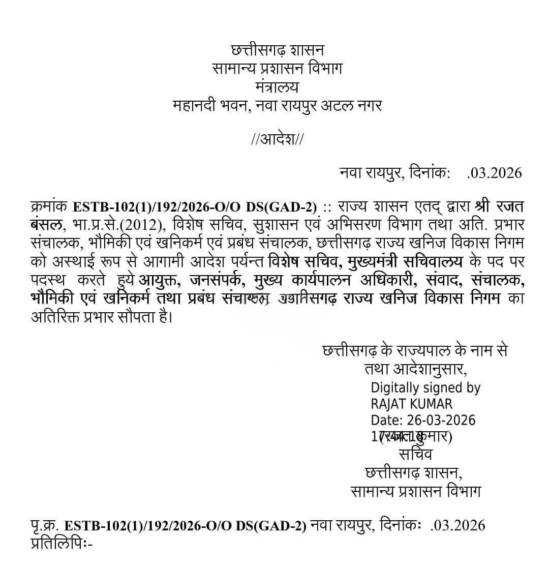भारी इजाफा किया है। सामान्य प्रशासन विभाग द्वारा जारी ताज़ा आदेश के अनुसार, रजत बंसल को अब सीधे मुख्यमंत्री सचिवालय की महत्वपूर्ण जिम्मेदारी सौंपी गई है।मुख्यमंत्री सचिवालय में नई एंट्री :रजत बंसल, जो वर्तमान में सुशासन एवं अभिसरण विभाग में विशेष सचिव के पद पर कार्यरत थे, उन्हें अब विशेष सचिव, मुख्यमंत्री सचिवालय के पद पर पदस्थ किया गया है। यह नियुक्ति मुख्यमंत्री की कोर टीम में उनकी बढ़ती सक्रियता और भरोसे को दर्शाती है।इन महत्वपूर्ण विभागों का मिला ‘अतिरिक्त प्रभार’ :केवल सचिवालय ही नहीं, बल्कि सरकार ने उन्हें जनसंपर्क और माइनिंग जैसे भारी-भरकम विभागों की कमान भी सौंप दी है। उन्हें निम्नलिखित विभागों का अतिरिक्त प्रभार दिया गया है :आयुक्त, जनसंपर्क: सरकार की छवि और योजनाओं के प्रचार-प्रसार की मुख्य जिम्मेदारी। मुख्य कार्यपालन अधिकारी (CEO), संवाद: सरकारी संवाद और मीडिया मैनेजमेंट। संचालक, भौमिकी एवं खनिकर्म: प्रदेश के खनिज राजस्व और प्रबंधन की देखरेख। प्रबंध संचालक, छत्तीसगढ़ राज्य खनिज विकास निगम: माइनिंग सेक्टर में निगम की व्यावसायिक गतिविधियों का संचालन।*पावर सेंटर के रूप में उभरे बंसल : इस आदेश के बाद रजत बंसल प्रशासनिक हलके में एक शक्तिशाली अधिकारी के रूप में उभरे हैं। मुख्यमंत्री सचिवालय के साथ-साथ जनसंपर्क और खनिज जैसे विभागों का समन्वय अब सीधे उनके हाथों में होगा। माना जा रहा है कि सरकार की आगामी योजनाओं को गति देने और सुशासन को धरातल पर उतारने के लिए यह बड़ा बदलाव किया गया है।नोट : यह आदेश राज्यपाल के नाम से सचिव (जीएडी) रजत कुमार द्वारा 26 मार्च 2026 को जारी किया गया है।