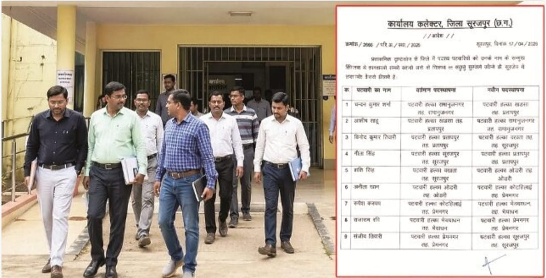 जिला सूरजपुर एसीबी की बड़ी कार्रवाई के बाद सूरजपुर कलेक्टर ने एक बड़ा निर्णय लेते हुए राजस्व विभाग में व्यापक स्तर पर तबादले किए, राजस्व विभाग में बड़ी सर्जरी 100 से ज्यादा पटवारियों का तबादला